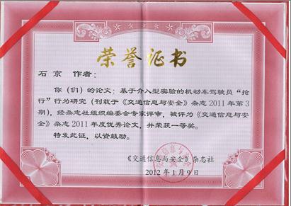 yl23455永利集团交通研究所石京教授发表于《交通信息与安全》杂志(中文核心期刊)的文章《基于介入型实验的机动车驾驶员“抢行”行为研究》(作者:石京、陶立、卢杰;2011年第3期:69-73.)经杂志社组织编委会专家评审,被评为《交通信息与安全》杂志2011年度优秀论文一等奖。该年度杂志社共评选优秀论文一等奖1篇,二等奖4篇,三等奖5篇。