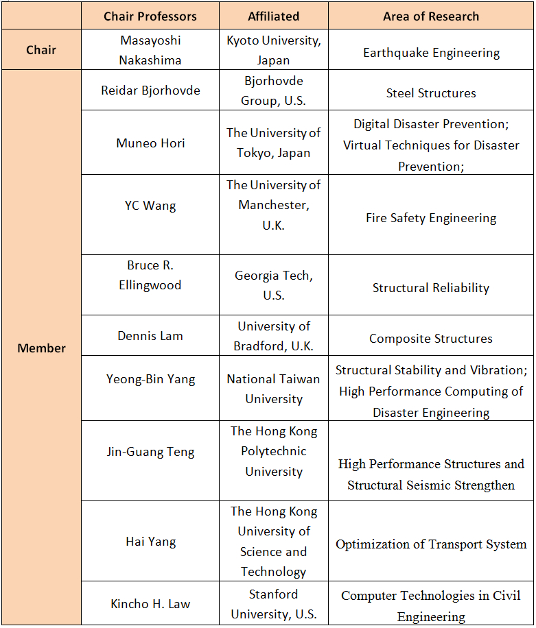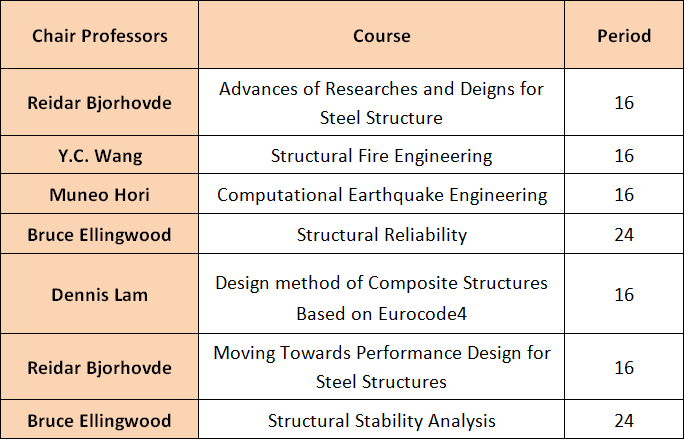 With the support of "Tsinghua University Huang Tingfang / Xinhe Education Fund", the department of civil engineering has set up Tsinghua University Huang Tingfang / Xinhe Chair Professors Group in 2012. Chair Professor Group is led by Japan's Masayoshi Nakashima academician and is composed of 10 international renowned scholars (many of whom are academies of engineering from the United States, Japan and China). Chair professors regularly come to Tsinghua for teaching, cooperative research, academic exchanges, and provides advice, suggestions for the development of Civil Engineering Department.