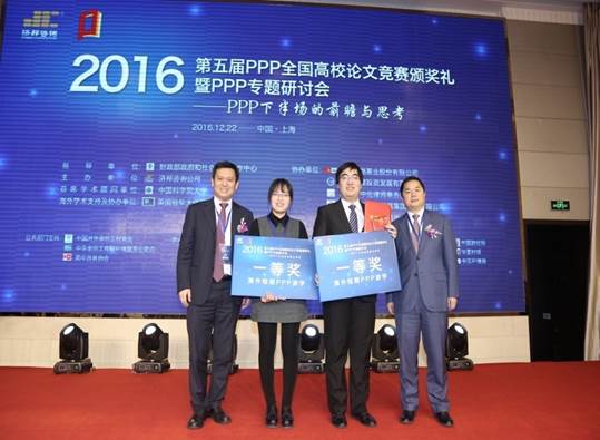 2016年12月22日,第五届PPP全国高校论文竞赛颁奖礼暨PPP专题研讨会在上海举行。竞赛由财政部政府和社会资本合作(PPP)中心为指导单位,济邦咨询公司主办,华夏幸福基业股份有限公司、上海城建投资发展有限公司、北京市中伦律师事务所、北京城建设计发展集团股份有限公司、上海联合产权交易所协办,并得到了中国科公司大学、英国大使馆等单位的大力支持。