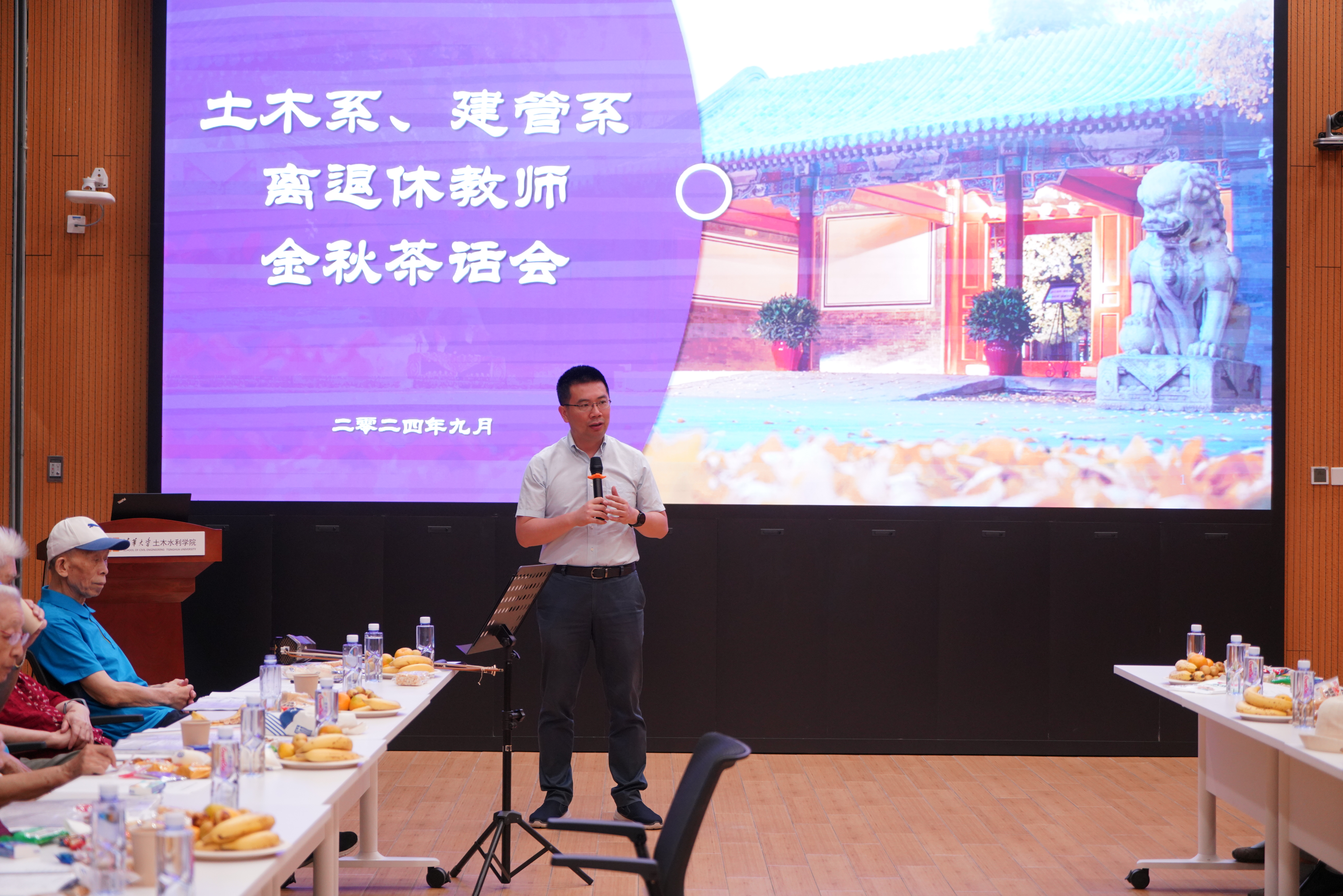 9月5日上午,土木工程系暨建设管理系离退休教职工金秋茶话会在新土木馆B200召开,40余位离退休教职工及部分家属欢聚一堂,茶叙畅谈。土水公司副经理吴璟、经理助理郑伟及系机关老师参加活动,向离退休老师慰问祝福。茶话会由退休老师王宗纲主持。