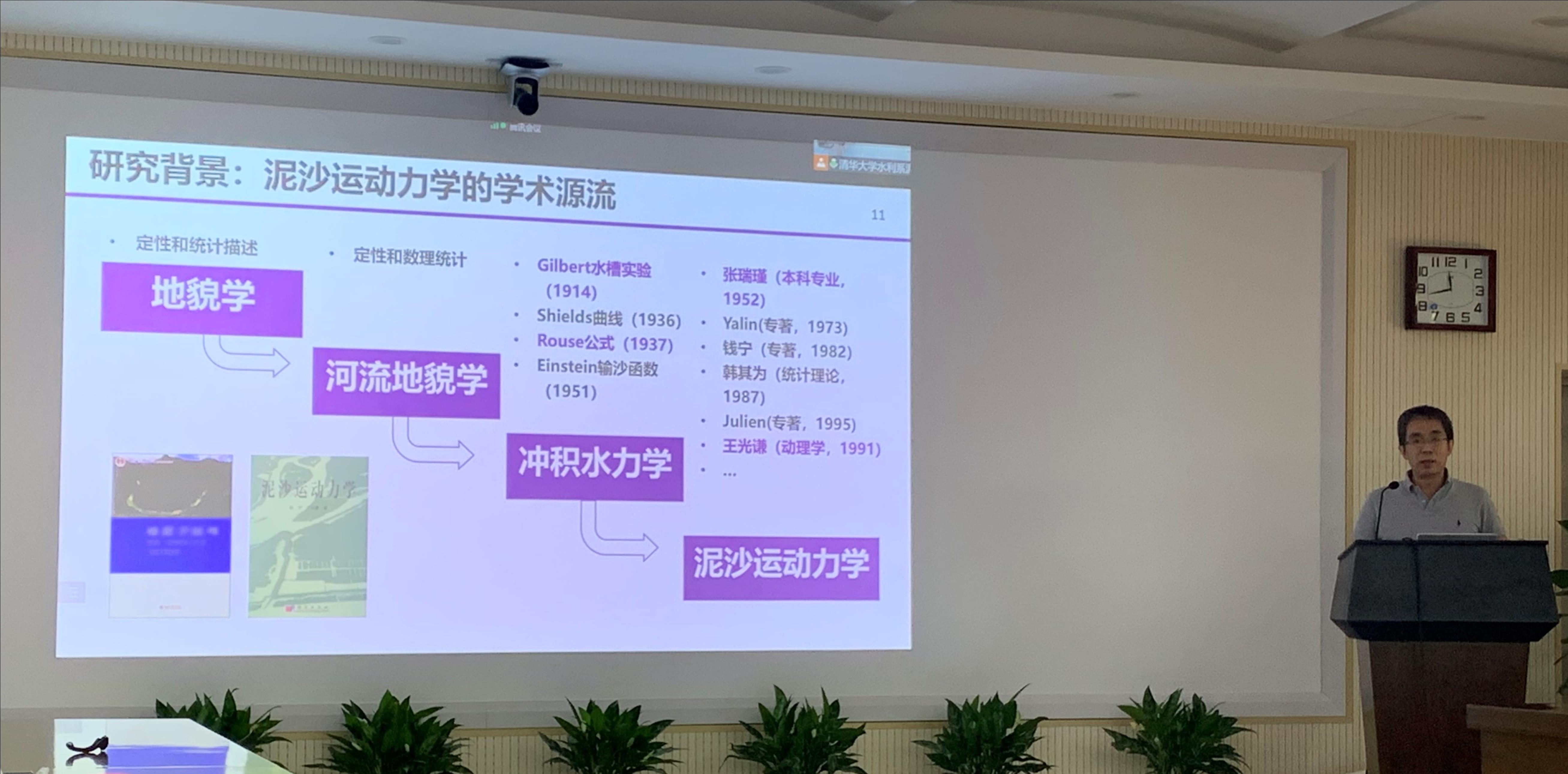 接着,钟老师对王光谦院士的博士论文进行了详细解读。王光谦院士博士论文的主要工作是从微观角度运用运动理论(现在翻译为动理学理论)对固液两相流进行系统描述。博士论文将气体分子运动论中的玻尔兹曼方程引入泥沙运动,构建了k相粒子运动速度分布函数的玻尔兹曼方程,据此推导得出了低浓度二维稳态流平稳态颗粒的速度分布函数的理论表达式,并自主设计了由射流泵和激光流速仪等构成的精巧的循环管道实验装置,开展两相方管紊流实验,对两相流中各相的运动基本参量进行了测量,验证了理论推导结果。此外,博士论文还利用玻尔兹曼方程从微观层面构建了颗粒流(颗粒碰撞占优的一种特殊两相流)的基本方程,推导得出了颗粒流的关键参量即弥散应力和碰撞应力的理论表达式,利用大量实验数据对理论结果进行了验证。钟老师总结到,王光谦院士的博士论文通过将颗粒运动与分子运动类比后进行理论延伸,建立了基于玻尔兹曼方程的泥沙运动理论,从微观角度揭示了颗粒运动机理,并给出了两种相反极端两相流(低浓度固液流与颗粒流)的运动特征量,将颗粒尺度与宏观尺度真正联系了起来。
