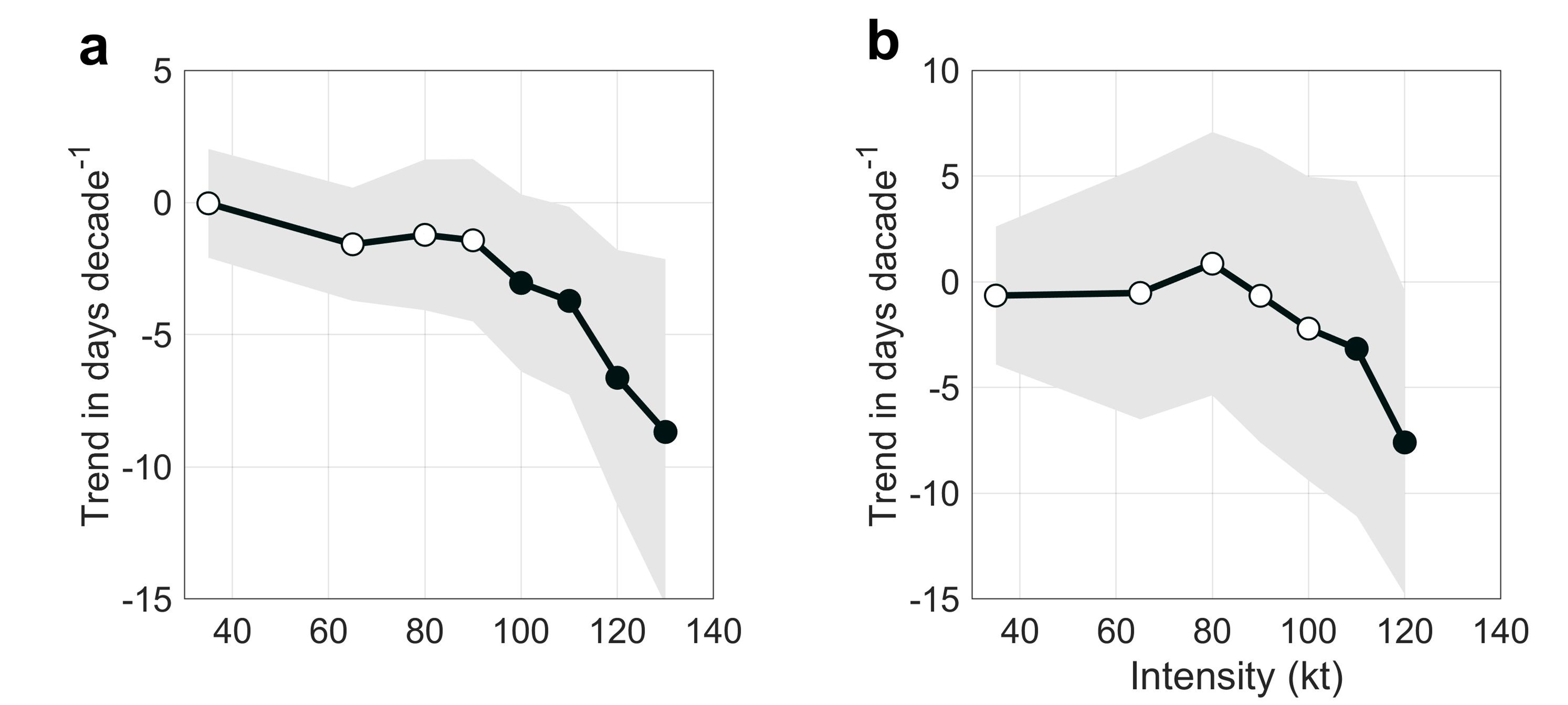 图2.不同强度等级台风的季节变化趋势。(a)北半球(b)南半球,发生时间变化趋势与台风强度等级的关系