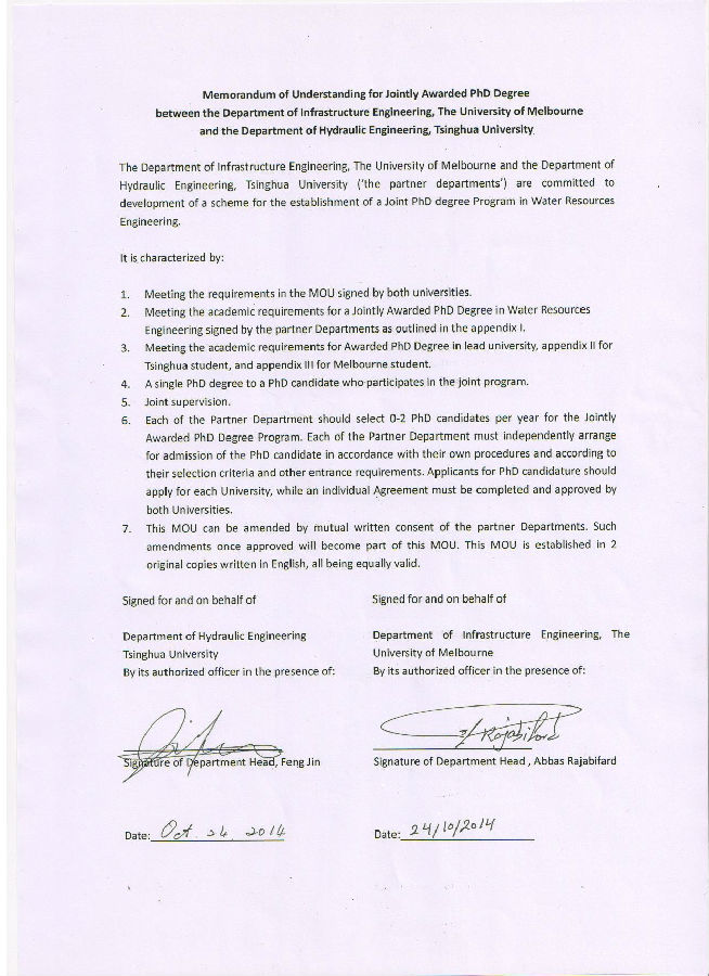 This document applies to all PhD candidates in Water Resources Engineering of the Jointly Awarded PhD Degree program between the University of Melbourne and Tsinghua University, as per the Memorandum of Understanding executed by the Department of Infrastructure Engineering, the University of Melbourne and the Department of Hydraulic Engineering, Tsinghua University.