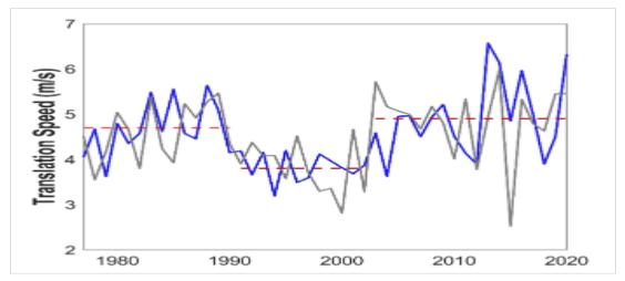 Figure 2. Simulation of decadal variations in cyclone movement speed in the South China Sea based on the independently established cyclone track model, consistent with observed data.